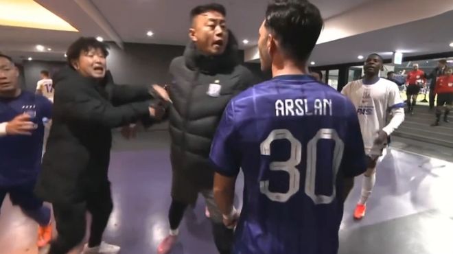 球场不是对手,场下反而我们不怵他们。这场比赛的中场休息时间,在球员通道里双方队员突然发生了一次冲突。原来当双方球员走回更衣室的时候,对方外援阿尔斯兰走着走着,猛然回头往回找。当他看到高天意的时候,一把揪住后者的胳膊说着什么。高天意没有说话,就这样互相纠缠着(上图)。